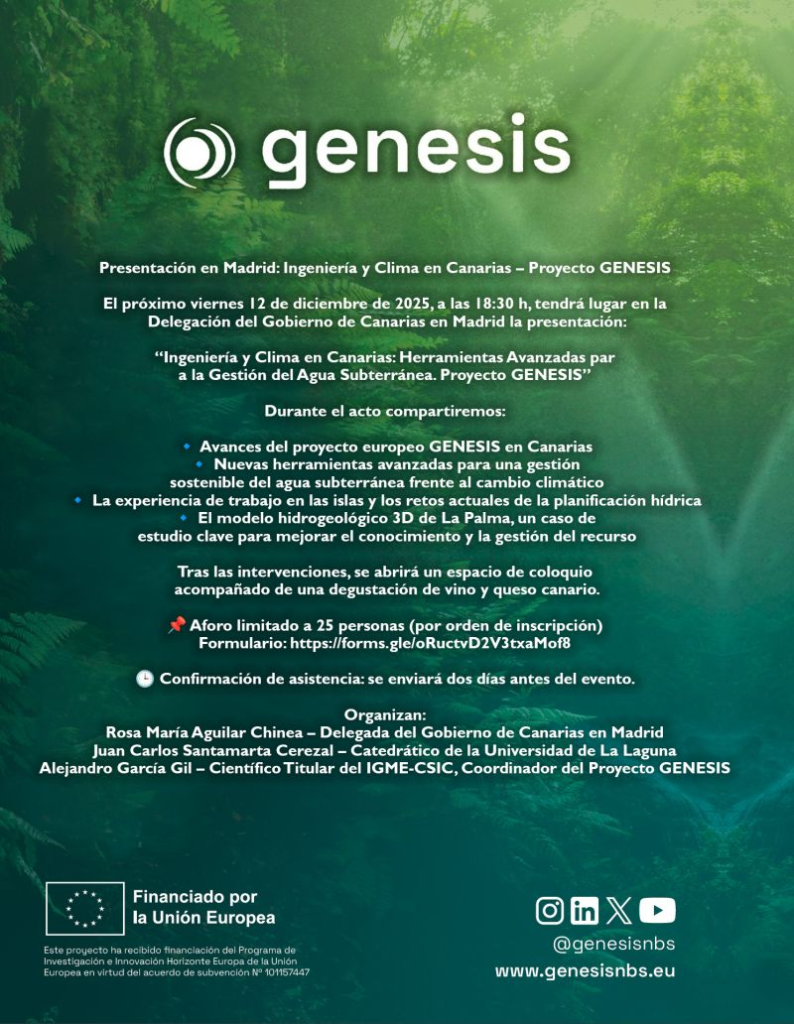 The GENESIS project will be represented by Alejandro García Gil, researcher and project coordinator. The event is organized with the support of Rosa María Aguilar Chinea, regional delegate of the Government of the Canary Islands in Madrid, and Juan Carlos Santamarta Cerezal, professor at the University of La Laguna.